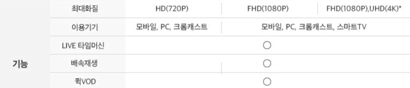 사실 이번 개편으로 소비자가 이득을 보는 부분은 거의 없는 것 같습니다. 동시 접속 인원을 공식적으로 요금제에 명시하면서 넷플릭스처럼 개별 프로필을 생성해 이용할 수 있게 되고, 타임머신 기능이나 빠른 VOD 시청 등이 업그레이드되었다고 하는데요. 요금제별 가격과 내용을 좀 더 살펴보겠습니다.