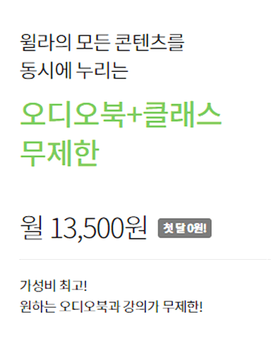 윌라 오디오북 멤버십 가격은 심플합니다. 오디오북, 클래스 단일 콘텐츠만 이용하는 멤버십의 경우 월 9,900원에 이용이 가능합니다. 두 가지 콘텐츠를 모두 이용하고자 하는 경우에는 월 13,500원에 멤버십 이용이 가능합니다.