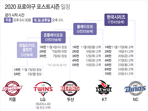 포스트시즌은 11월 말에 모든 일정이 종료되고 최종 순위 결과가 정해지게 됐습니다. 늦어도 11월 초에 모든 결과가 나왔던 예년에 비해 꽤나 늦은 시기입니다. 추워진 날씨에 전통적으로 각 구단 연고지 및 잠실 구장에서 시행하던 플레이오프와 한국시리즈는 고척 돔구장에서 실시되었습니다.